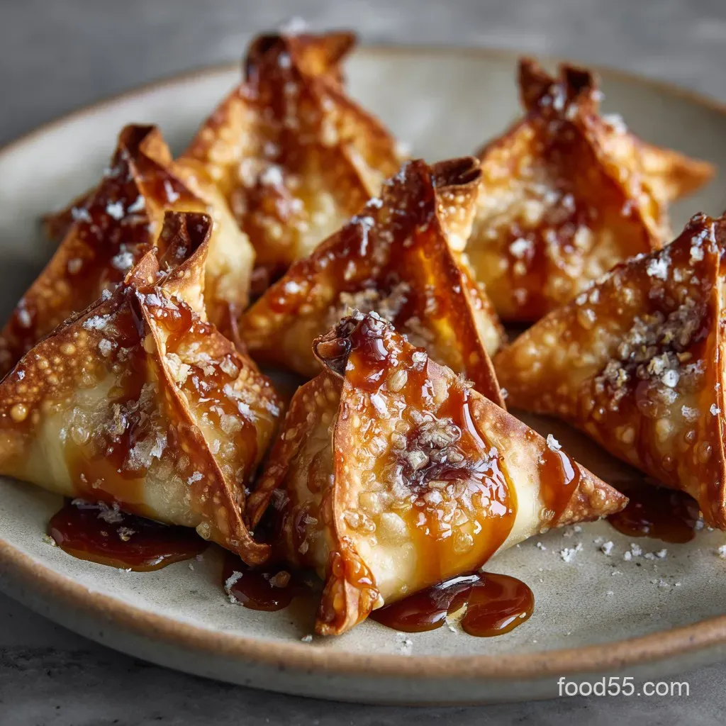 Transfer the hot, crispy Caramel Apple Wontons to a cooling rack. Dust generously with powdered sugar immediately. The residual heat will slightly melt the sugar, creating a thin, beautiful crust. Serve them while they are still warm enough for the filling to ooze a little.