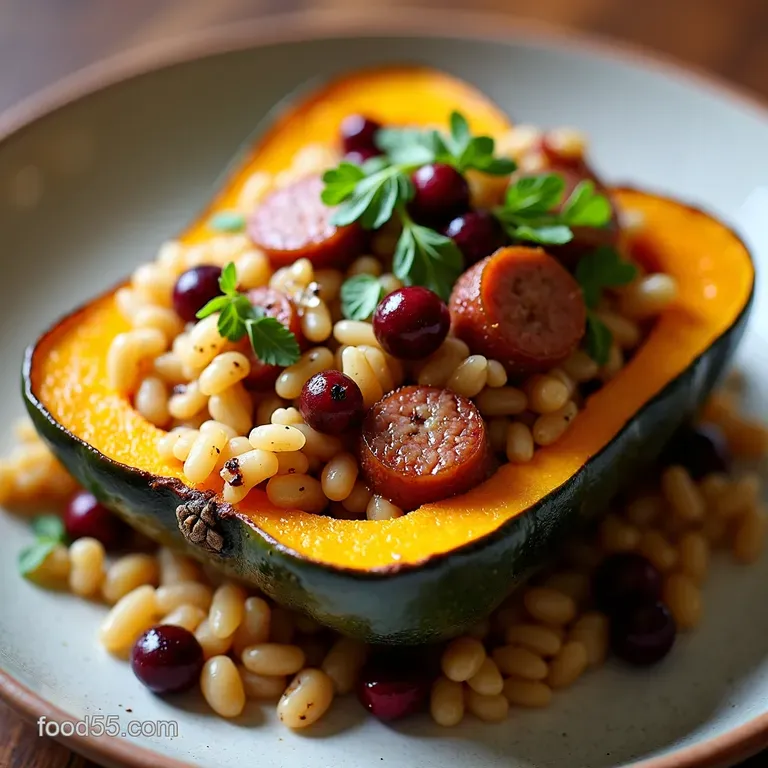 For plating, mash a small well in the squash to nestle the filling, pile it slightly, finish with a drizzle of maple syrup or balsamic glaze and a scattering of fresh sage or parsley for colour; it’s showy enough for a holiday centrepiece or a cosy Sunday roast.