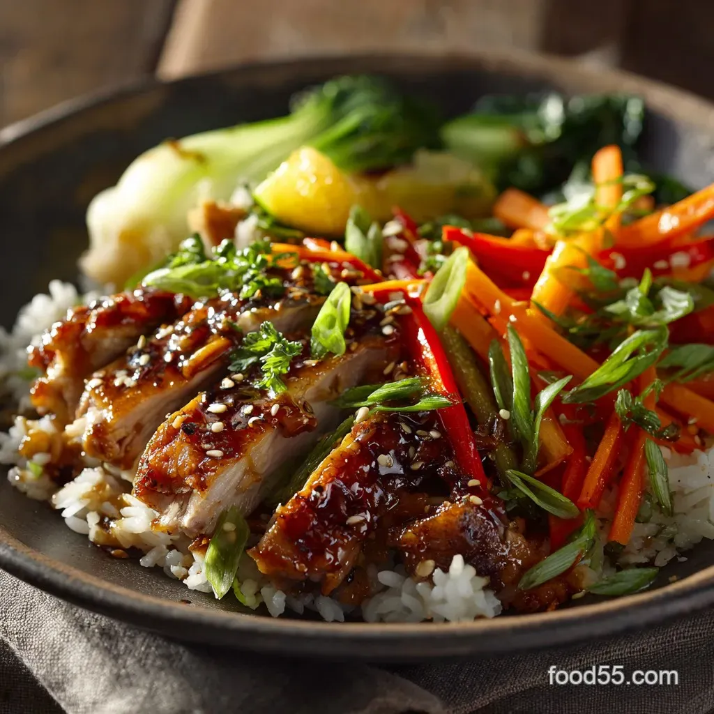Chicken over Rice with Fresh Vegetables: Sticky Soy Glaze Crunchy Toppings