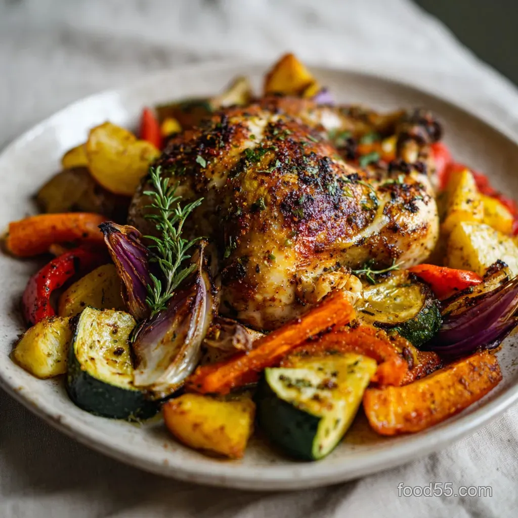 Zucchini and mushrooms are notorious for releasing water. If your tray looks like a soup at the end of the cooking time, you likely crowded the pan. The moisture needs space to evaporate. If the vegetables are still too wet, try roasting them on a separate tray from the chicken next time.