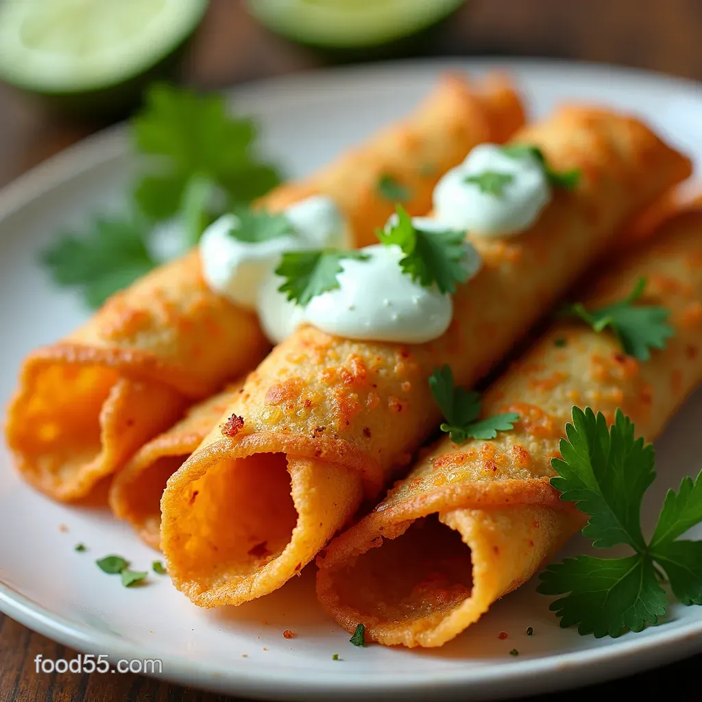 You can prepare the shrimp filling and crema up to 24 hours ahead and keep them chilled. For maximum crispness, assemble and bake right before serving; leftover cooked taquitos keep in the fridge for 2 3 days and reheat in a 375 400°F oven or air fryer for 5 8 minutes to restore crunch.