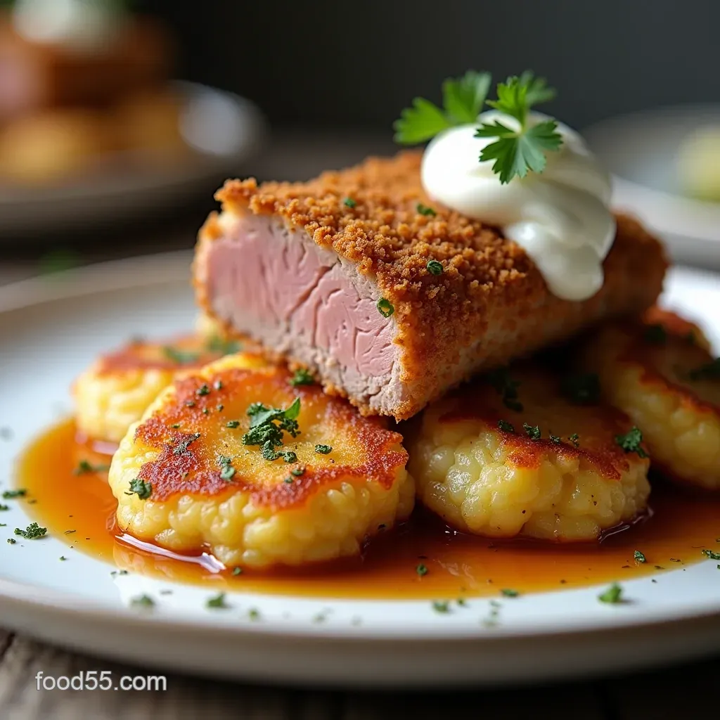 The presentation should celebrate the contrasting textures. Serve the brisket slices standing up slightly, showcasing the rugged Panko crust. Place one or two golden latkes beside them. Top each latke immediately with a swirl of the chilled dill crème fraîche and a delicate ribbon of smoked salmon.