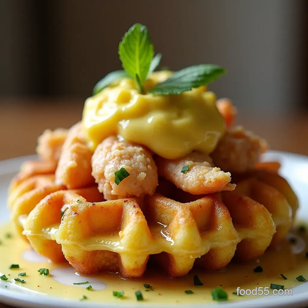 Nutritionally, a typical serving (two crab-cake waffles + remoulade) is about 380 kcal with roughly 28 g protein and ~700 mg sodium, so keep that in mind if you’re watching salt intake.