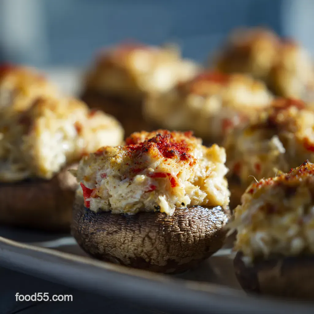 Right, picture this: golden crab stuffed mushrooms artfully arranged on a platter. A sprig of parsley never hurts! A squeeze of lemon brings out the crab's sweetness.