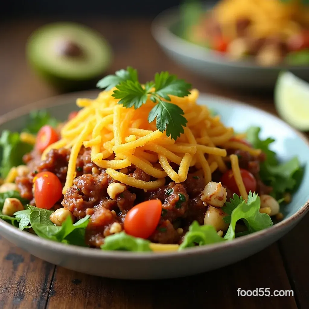 Look for visual cues. Meat should be crumbly and browned. Onions should be translucent. Dressing should coat leaves lightly. Serve immediately. Chips must stay crunchy.