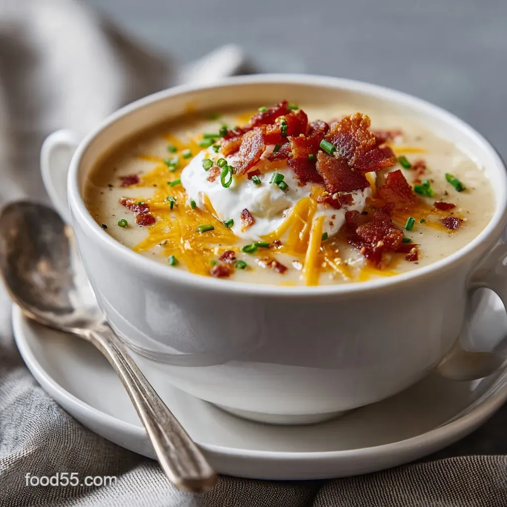Creamy, savory, and hearty. It typically contains potatoes, bacon, cheese, sour cream, and chives, all simmered in a rich, thickened broth.