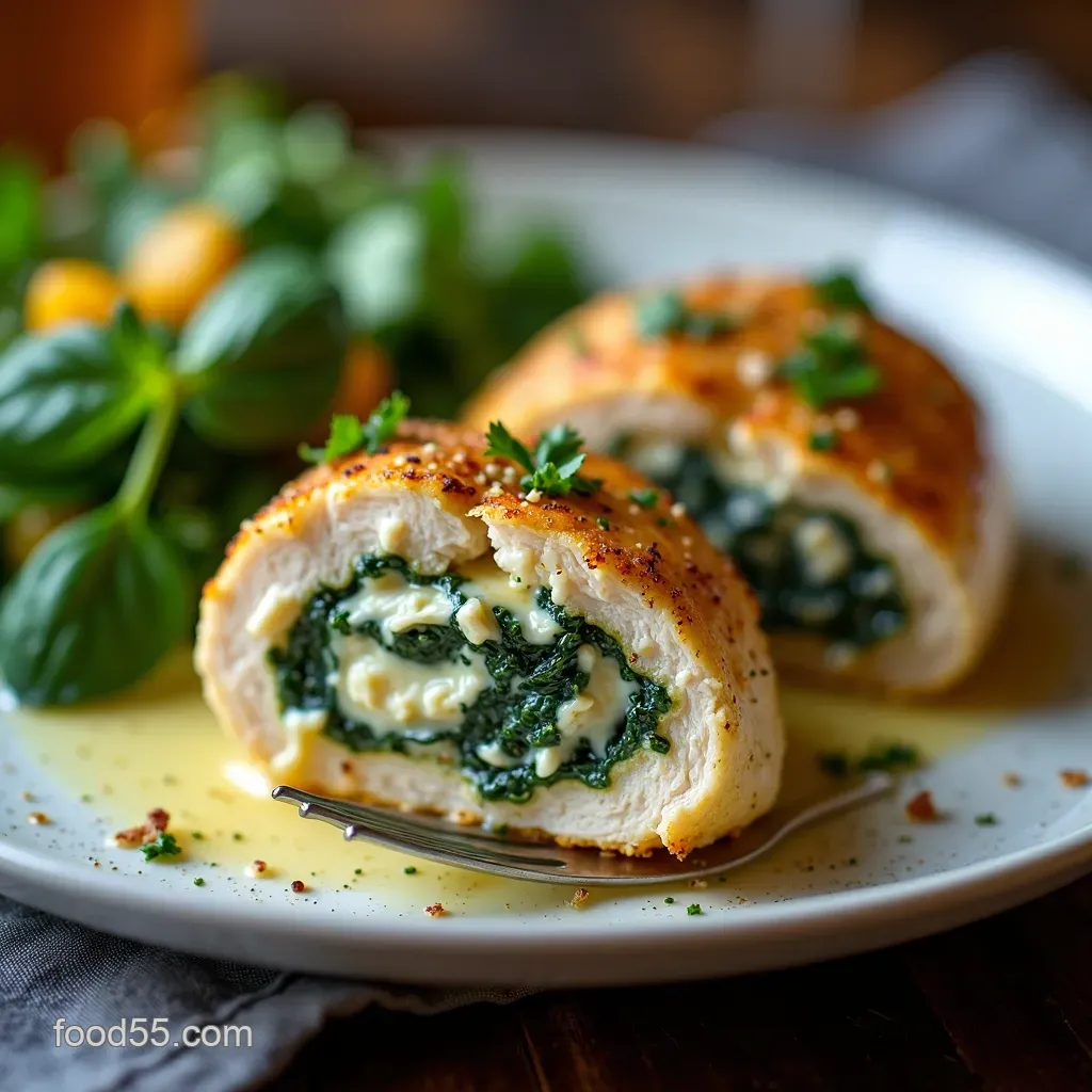 Use an instant-read thermometer and pull the chicken at 165°F (74°C) in the thickest part (not touching the filling), then rest 5 7 minutes so juices redistribute. Also squeeze excess moisture from the spinach filling and avoid over-stuffing so seams don’t burst while cooking.