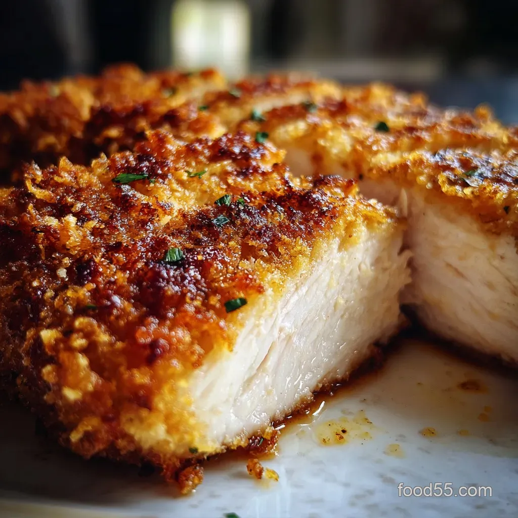 - Flavor/Texture Hook: Golden, velvety parmesan crust over succulent meat