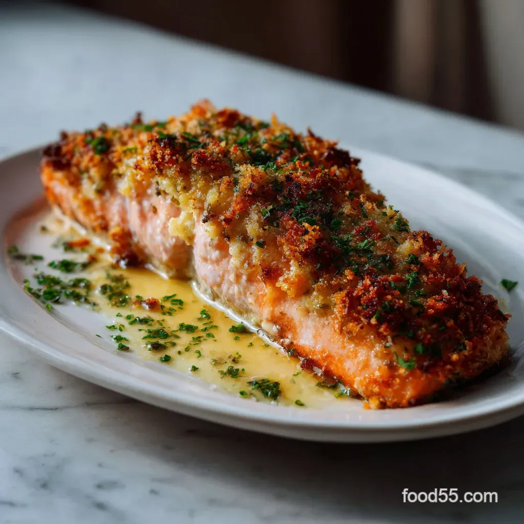 The Science of Why it Works: The protein denaturation of the salmon happens gently under the insulating "blanket" of crumbs, while the Maillard reaction transforms the Parmesan and butter into a complex, savory crust.