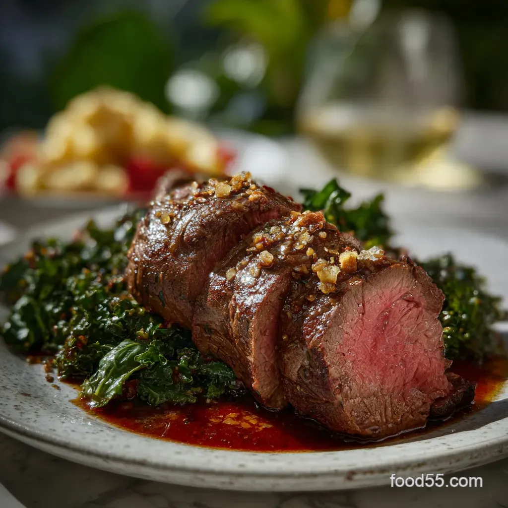 When slicing the beef, ensure you use a long, sharp carving knife. Slice against the grain into 1 inch thick medallions. This shortens the muscle fibers, making every bite feel even more tender. Drape the red wine jus over the center of the slices, leaving the mahogany crust visible on the edges for a visual contrast.