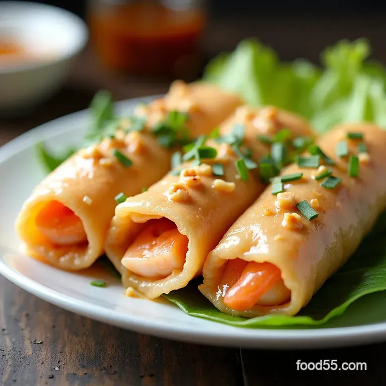 You can prepare the rolls up to 4 hours ahead and refrigerate them covered with a damp cloth and plastic wrap any longer and the rice paper becomes noticeably chewier. Store the peanut-hoisin sauce separately in an airtight container (it keeps 3 5 days in the fridge); if it thickens, whisk in a little warm water or lime juice to loosen it.