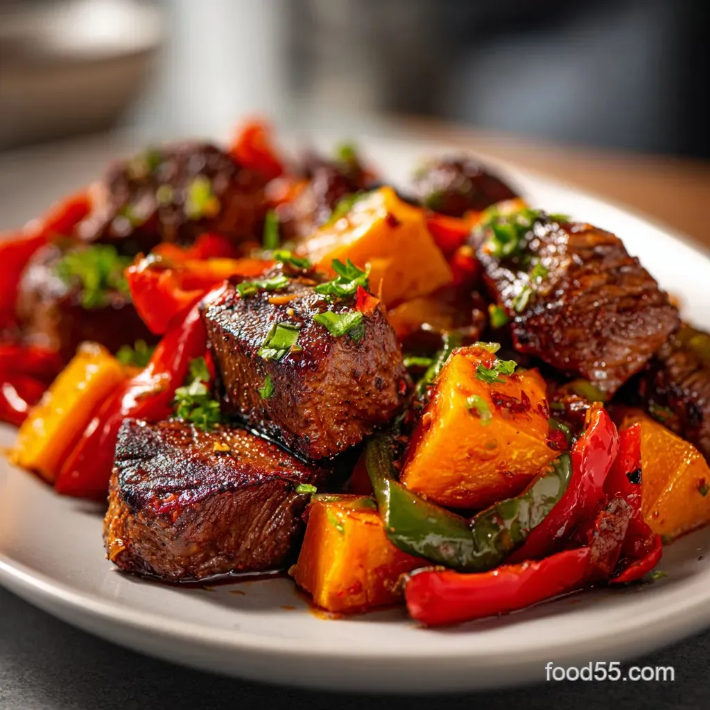 When serving, I like to pile the sweet potatoes at the bottom of a shallow bowl, nestle the steak bites on top, and scatter the peppers around the edges. This ensures every bite gets a bit of everything.