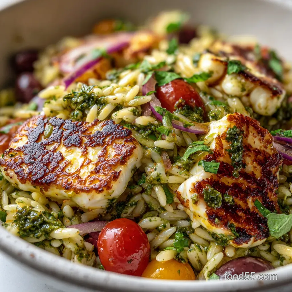 Absolutely; you can easily replace the halloumi cheese with marinated, grilled tofu cubes or sun-dried artichoke hearts for a savory texture. Ensure the pesto used in the vinaigrette is dairy-free, as many store-bought options contain Parmesan cheese, or simply use a lemon herb dressing instead.